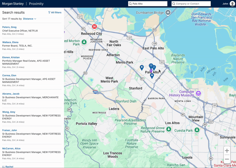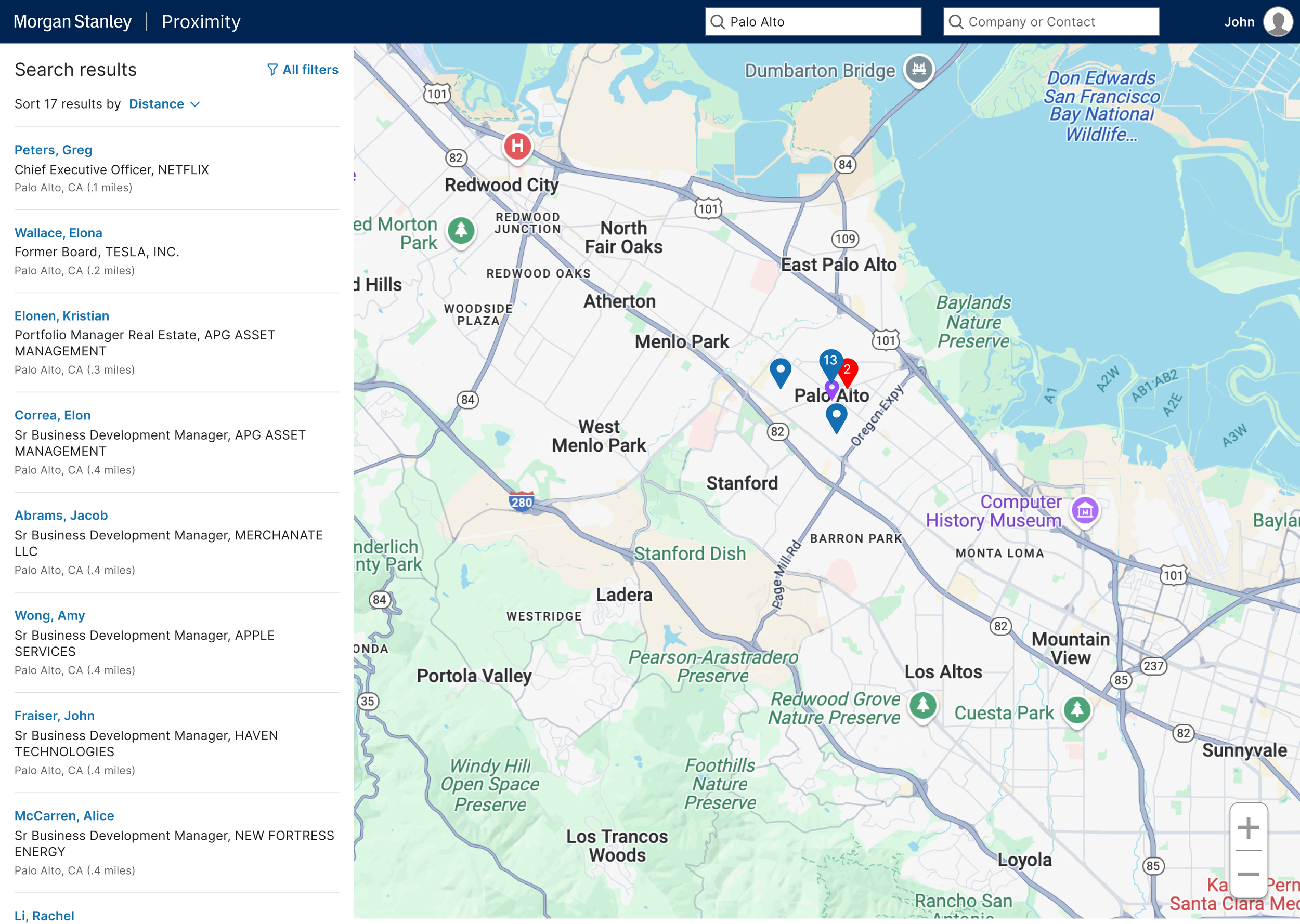 Proximity shares the same data as MS Connect but in a map format to allow users with appropriate access the ability to search and visualize connections, especially when traveling.